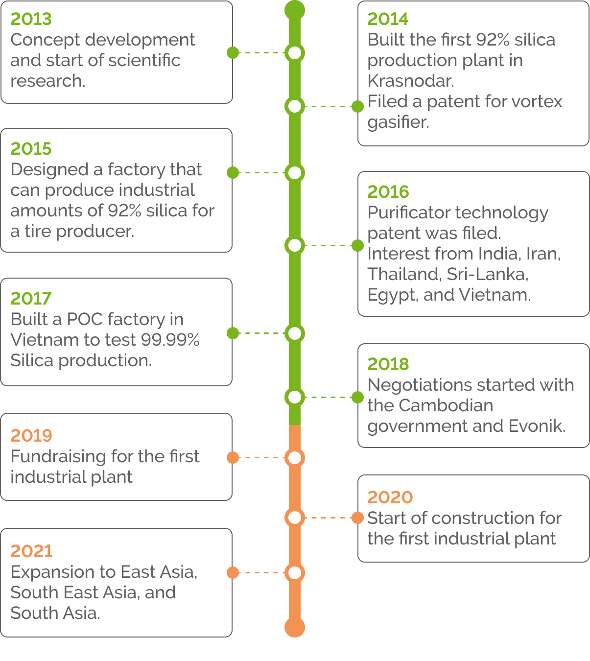 2014 - Built the first factory in Krasnodar and the first 92% silica was produced. The first patent registration for vortex gasifier was filed.